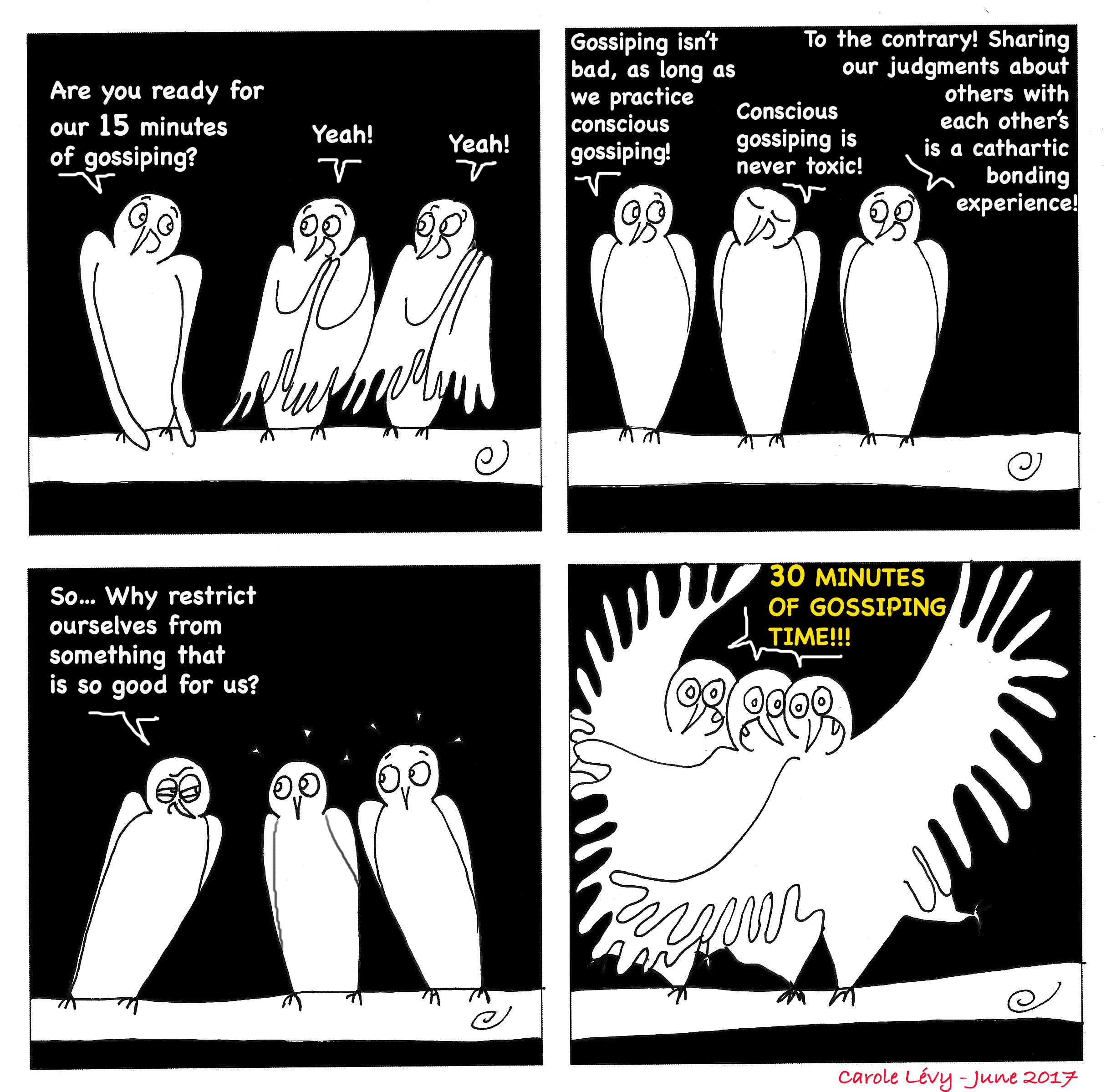 You see what I mean. It’s not as simple as being conscious to make gossiping okay, but 1- it is an improvement, since consciousness is always the first step necessary to change and 2- in our consciousness effort, perhaps, we can also ask ourselves: