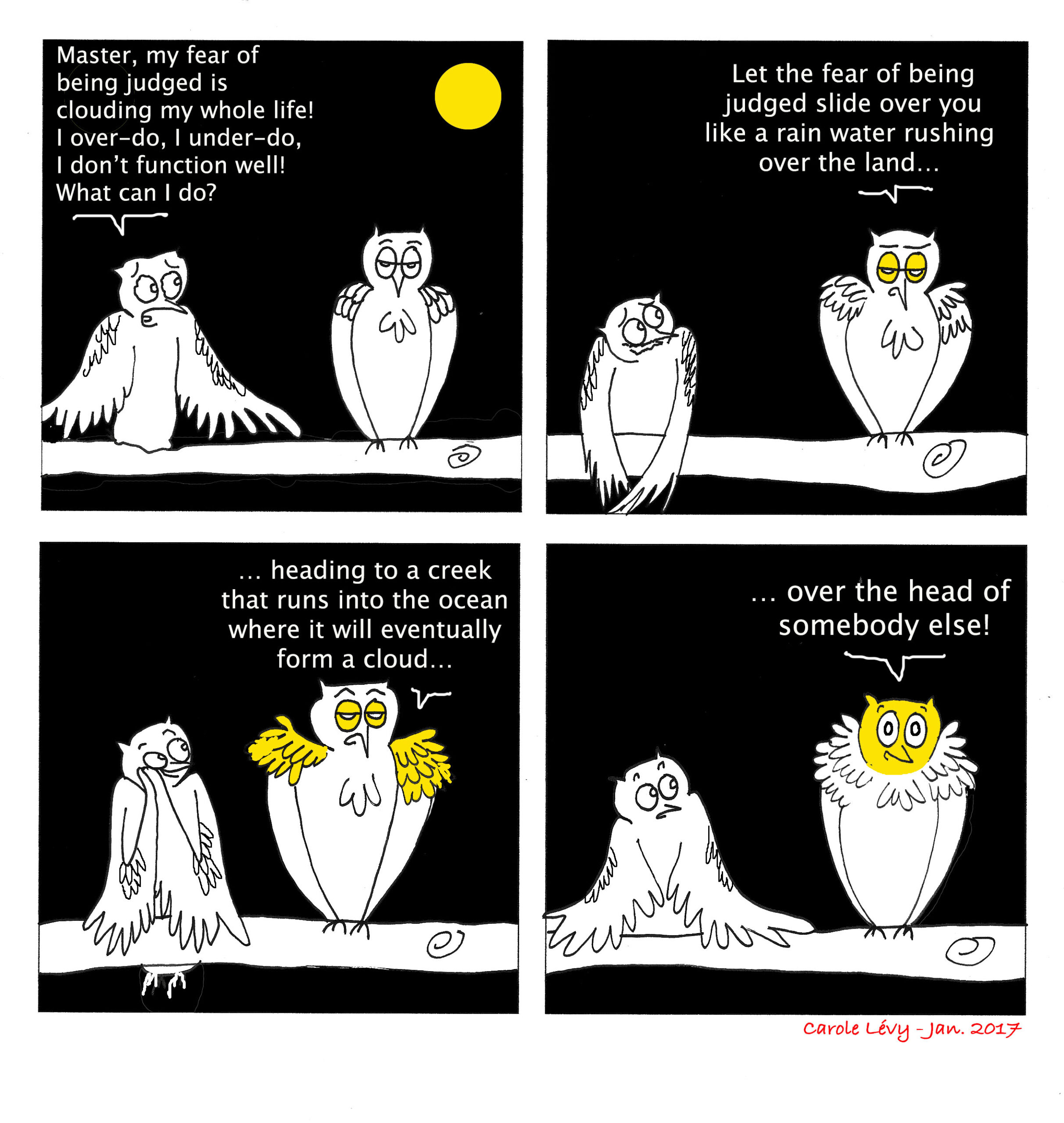 It is terribly incorrect to have a wise master offering such uncaring advice, but the joke made me laugh! If my own fear of being judged can be recycled in a little bit of dark humor… is that so bad?